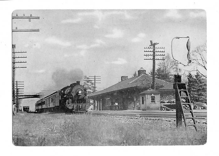 Slow day for insulators. . .but did find this neat picture. Look at the top of the pole that blocks part of the name on the station. Looks like an old wood cut-out or ??? on the top. Could this be an power line above the phone lines? Top left of the photo has captured a nice shot of a bracket on the right of the top cross-arm. And of course. . .the mail bag in the forefront is REALLY cool! UPDATE! The GOM helped me out . . .the box on top of the pole is a distribution thingy for the telephone wire drop to the depot. . .Thank you Brent! ^..^ Any guesses on the type of steam locomotive coming from the left? mailbag dog ^..^ |