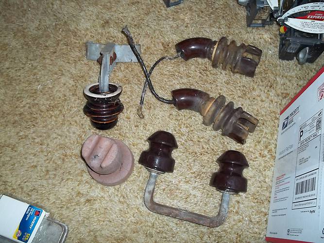 Well, I guess I can kind of call these yard sale finds. I saw an ad for a yard sale that mentioned insulators. Rarely does a garage sale ad include a number, but this time it did. The guy explained to me that he had a few for sale, but he had some others that he wanted to save, but would probably sell since I'm a collector. I drove the hour drive to go see him, and it turns out he is an old collector who was very active back in the 80's and 90's and was even a member of Dixie Jewels Ins. Club. I bought a bunch from him, and he was nice enough to give me first shot at everything even though there was an antique dealer there looking over my shoulders waiting to snap up everything I didn't want. Needless to say, I took as much as I could, since it will all hold a very nice spot in my collection. Here's some more odds-n-ends I picked up at the same place. The two porcelain pieces with the wires coming out were used on transformers, there's a couple of porcelain pintypes on a double bracket, a neat old tramp on an interesting bracket, and one of those mica/composite cables. |