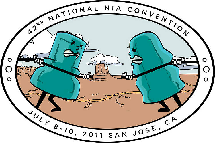 This logo design was specially commissioned for the 42nd Annual NIA National Convention to celebrate the 150th anniversary of the transcontinental telegraph. The design was created by my daughter Christina Jung who took her inspiration from the old "Lets go out to the lobby" cartoon characters. |