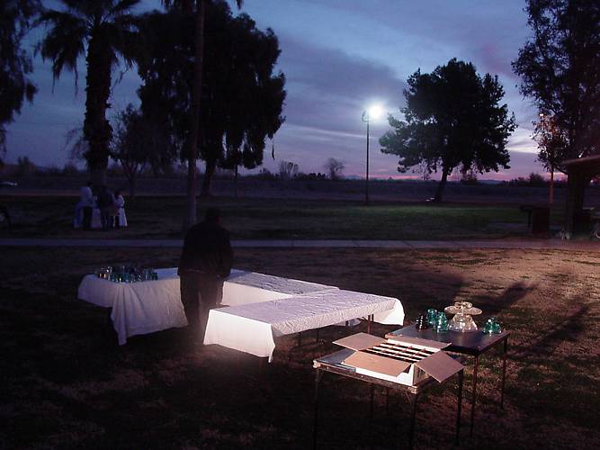 Any more, insulator shows seem to be starting earlier and earlier, and the Yuma show this morning was no exception. Here, Dwane Anthony sets up his table before sunrise... and he was late.