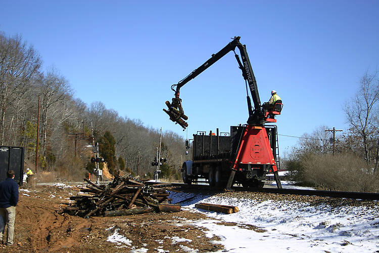 The claw truck unloads poles and crossarms.