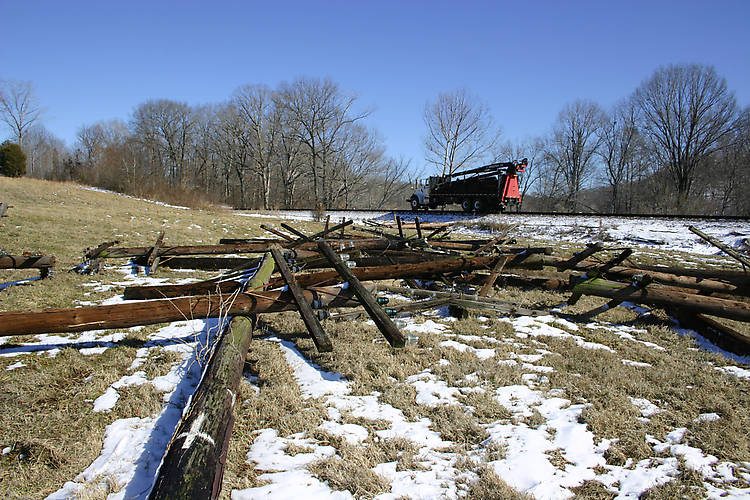 A local farmer stopped us a couple miles away and found out we were looking for insulators. He invited us down to his property and told us to take as many as we wanted. The farmer was given a good number of poles by the demolition crew. He wanted the glass gone and he said it would help him if we got rid of them. Who are we to pass that up? The claw truck happened to drive by while we were there, too. We did the farmer a favor and took all the insulators, and ended up neck deep to a giraffe in clear Hemingray 42s. |