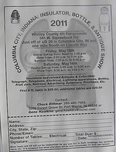 The 2011 Columbia City, Indiana Insulators & Collectibles Show is on Friday, May 13th and 14th, 2011. NO ADMISSION CHARGE! Dealer 8' tables are only $25/1st, $20 each additional. . We are planning a free seminar on Friday night discussing Indiana fruit jar manufacturers, many of them made insulators too. Lots of parking, RV's are welcome, (no hookups) Show site address is 680 Squawbuck road, Columbia City, IN. This is a great show to clean out all the odd collectibles from the garage & sell them. Tables with electricity are limited, so get your reservation $ to Chuck Dittmar at the above address with a signed contract quickly! If you want to see photos of past shows, use the picture poster search function using Columbia City as we've held a collectibles show there the last 4 years, last year's being the NIA Central Regional. If you have questions, click my address above the flyer and I'll do my best to answer you promptly. Hotels: There are 2 hotels in Columbia City worth telling you about. The closest is the Quality Inn 260-248-4551. They have an indoor pool, hot tub etc. and is fairly new. The show price is $62/night. The other is the Executive Inn 260-244-5300 which is older but seems OK at $45 plus tax. YOU MUST TELL THEM YOU ARE SHOW PEOPLE to get the cheaper prices!!!!!! |