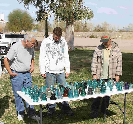 Jim Harlow, Curtis Erickson and James Doty inspect sales table with hesitation.