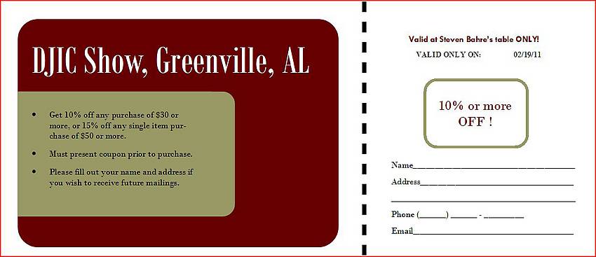 PLEASE NOTE: THIS COUPON IS NOW EXPIRED, BUT I AM GOING TO LEAVE IT UP HERE IN CASE ANYONE WANTS TO USE IT AS A TEMPLATE AND SO I CAN USE IT AS A TEMPLATE FOR FUTURE SHOWS AS WELL. THANK YOU TO ALL WHO ATTENDED THE GREENVILLE SHOW, AND THANK YOU TO ALL WHO REDEEMED A COUPON! Print this coupon out if you are planning on attending the show. I am in no way associated with the Dixie Jewels Insulator Club, nor is this coupon. It is only valid on the items I have for sale on my table at the show. This coupon will be deleted off ICON on Saturday morning, February 19th, 2011, and will only be valid while I am in attendance. Here is the "fine print"... Please, only one coupon per customer. The 15% discount applies to ONE (1) SINGLE-ITEM purchase for $50 or more. The 10% discount applies to any purchase of any number of items equaling $30 or more. This means if you want two insulators adding up to $50, I can only honor the 10% discount. The only exception to the discounts is if you buy the whole table as a lot. I will honor the 15% discount in that instance. Any questions? Please email. |