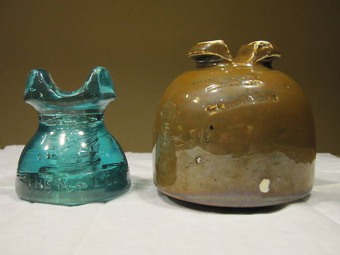 Two gems mixed in with a box of commons. A CD 252 M & E Co. and a U-928 brown glaze. The 252 has a big base bubble that makes up for the small flea bites. The 928 is mint with a very crooked pin hole. These two and a box full of better commons for 40 bucks. |