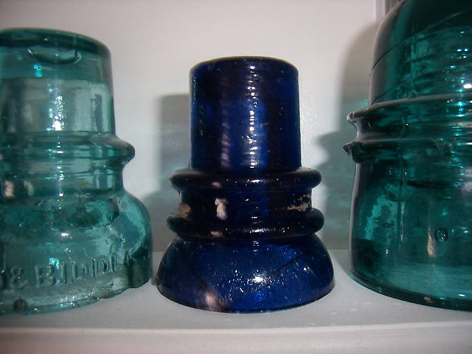 A few years ago I wrote an article for CJOW about our finding 2 new unlisted CD 737.5 colors. My father and I have been working the location where these were found over the past few years with little success, mostly just smaller shards of some nice threaded and threadless pieces. Last week Dad was working the area and turned up a nice big shard of a CD 737 or CD 738 (cannot confirm which for sure) in a nice dark teal color. This past weekend I happened to be visiting my parents and we went back to check out the area. It was getting late in the day but we started working over the area looking for surface finds. Just before we were about to take off I stumbled upon a small piece/sliver of cobalt glass. I knew it was from a CD 737.5 based on the amount of micro bubbles in it. We decided to dig around this area to see if we could find more. After about 2 mins of digging I got my digging hoe stuck in a small patch of bushes so I decided to dig the other direction. Dad kept working my way and then I heard him make a nice yell. I came over and we both stared a this beautiful piece of glass that was looking back at us. It is the most complete example we have recovered to date. We dug a bit more and turned up 2 more skirt pieces. We frustratingly ran out of time and I was headed back to my home the next morning. We are confident the rest of the insulator is there to be found, just a matter of working the area. Back half of this piece is still missing, but I believe it to be the most complete example currently in the hobby. It stands up on it's own no problem which is great. Man what a thrill and what a color. Ill get more pics when I can, of course the camera is broken to and we only got one snap shot. Enjoy |