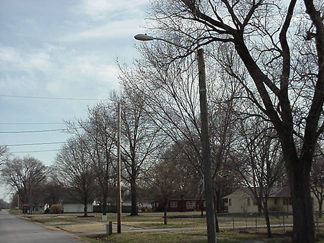 Here is the last surviving pole of the line (on the right). On the backside it has 6 gains for crossarms, and has a small SW Bell tag on it.