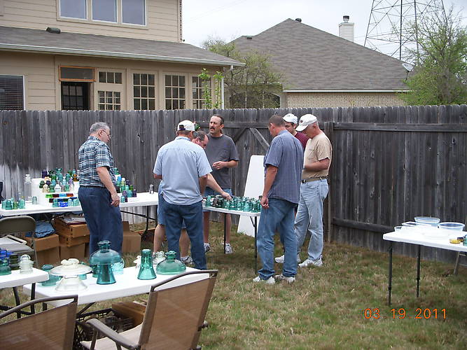 An eager crowd gathers around Bob Berry's Half Price offering following lunch. From L to R are John Foster, John Wiggins, Bob, Gary Fine, Keith Brooking, Eric Van Norstrand & Jeff Markwart.