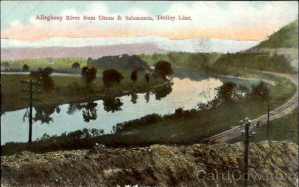 The insulators in this postcard photo are M-2430 victors with tan glazes. You cannot see the tracks but the pole is in the foreground photo was likely taken in the 1905-1908 era as the cut for the trolley rail bed is fresh . The area is totally forested today. The telegraph pole on the left is for the steam railroad below and likely has lots of CREB 145's on it! |