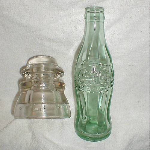 I'm kinda' glad I brought this one home. It was the only intact insulator I found while searching this stretch of track in western Warren County, PA. The PRR and NYC once had parallel lines here. The PRR is still used by the Buffalo & Pittsburgh and the NYC has been abandoned since the late 1960s. This lowly WT CD 155 has a nice color! The Coke bottle is embossed 'WILLIAMSPORT PA" on the bottom and dates from the mid 50's. |