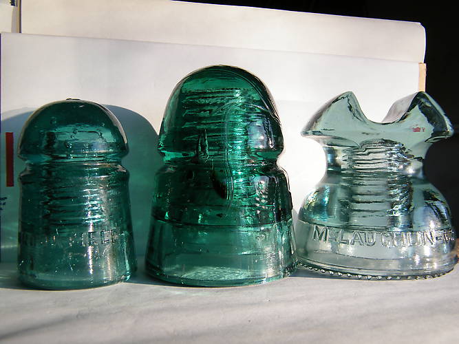 Update : Don't know if anyone noticed but the Brookfield pony is a natural leaner. It leans towards the west, I mean left. Didn't realize this factor when I posted the pic. Saw and measured afterwards. The base to the WG guide least 1/8 " more on the right side then it does on the left side. Right- Remember the CD 134 with the big rock I posted a pic of 2 weeks ago? Well this Steel Blue McLaughlin CD 252 came from the same antique shop that is a good 80 miles away from home plate. On my previous trip I left it behind being the asking price seemed somewhat high in my opinion. Yesterday I walked it over to the window for a better look. It was then that I noticed there was purple swirls in the heavy thick ears. While taking my pic to post here in the hunt and find album I also noticed there is what looks like sage green present around the purple as well. This one looks better and better every time I look at it it seems. Well that isn't quite the wholw truth. I thought only one of the many, many small SDP's was flaked. Upon closer inspection I found five more that just the pointed tips were gone. Still not a bad find. Right? Center - This B with a tadpole was found at another antique shop that was even further away from home. It also has many visible bubbles as you go around the insulators. Some really odd shaped bubbles are next to the tadpole. Makes me wonder whether he is going to be lunch for the snapping turtle hiding deeper in the water ? Left - This Brookfield 102 was found only about 10 miles from home. Still can't wait to be able to take my motorcycle on the longer trips. Anyhow, This little pony has a cracked skirt but I liked the double embossing on the skirt. Summary : For any interested parties, a couple of these insulators will be winding up in the For Sale album soon. Boy, the price of gas is really trying to keep me from going out looking fro more jewels for my collection. The positive thing in this case is that I'm stuborn and I'm not the only soul that likes to see what I'll find next. |