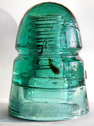 Very nice amber tadpole swiming downward into deeper waters and numerous stringers in this Dark Green Aqua B. It also has many, many bubbles. Some are round, some a oblong and a few odd looking droopy ones. One of those can be seen directly up to the left of the tadpole. If not for two flea bites and a knick at the base of the dome/WG on the rear side this insulator would be mint condition. My asking price for this sought after piece of artwork is $50 shipped anywhere in the lower 48 US States. I will assist north and south of the US borders or any other country on the globe. I accept Pay Pal as a gift or personal checks and Money orders for payment. First email gets this one. |