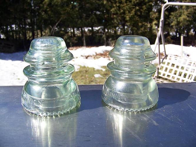 The last find of the day was a no-dash CD 154 Dominion in ice yellow green. Here is is pictured with another no-dash Dominion in light green found a year ago on a different line. Both were cast in the same mould, 9, and both have drip points that are a cross between sharp and round. And yes, these are unlisted! |