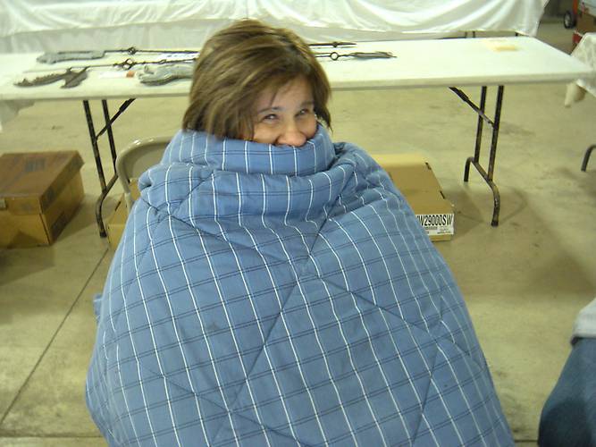 Loading in always means the overhead doors are up. The heat was not yet turned on, so Marge Frank was bundled up at her sales table. Marge....electric blanket next year..it is an insulator show.