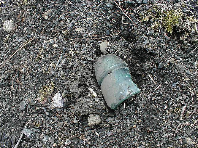 Not far from that fallen pole I find this... a broken H.G.Co. CD 145 (H-dome). It's time to move a little further east because I'm finding nothing but chunks and shards of colored glass.