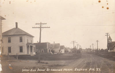 It is quite possible that this line (on the left) started out as a 6 pin one and the 10-pin crossarm added later on. I've seen a lot photos of early lines with the above type of pole line construction. In addition, the oldest lines (1900 or earlier) appear to have been constructed by six-pin crossarms. As more telephone subscribers came on line more circuits were obviously needed and 10-pin arms seem to have become the standard not too long after 1900. Lines providing electric lighting service are seen along the right side of this photo. |