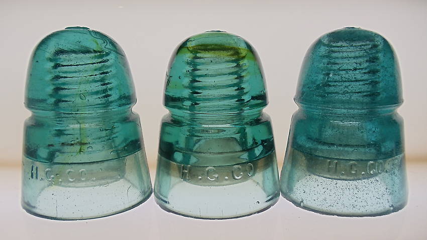 Got a call from a guy that said he hed about 1000 insulators in a barn. We went over the next day and he had closer to 2000. After going through over 60 milk crates and some boxes, we found about 20 that was worth taking home. Here is 3 CD 145 H.G.CO.'s that we got. |