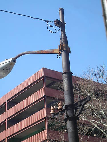 Pole close to my place of underemployment with power pieces still in place....They were used on the old trolley lines running from town to Oakland on Forbes Ave.