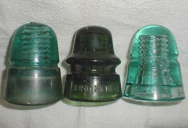NO wild hunting today, the weather's cold, wet and just all round' LOUSY here! However, I receive a message from an old friend that he's been cleaning out the barn on his ol' family homestead and has a small box of "green insulators" and "old bottles" that I might like to see. Having nothing else to do, my wife and I take a short drive for a long overdue visit with our friend of over twenty years. "Steve" had a tidy box of old Coke bottles and old flasks awaiting us and the seven insulators in these three photos. A W. BROOKIELD CD 145 CREB 45 CLIFF ST. with a 6 or 9 on the dome and both patent dates, a Brookfield CD 162 (or CD 162.1) in a GREAT dark green, and an early "B" CD 145 with a VERY shallow wire groove. |