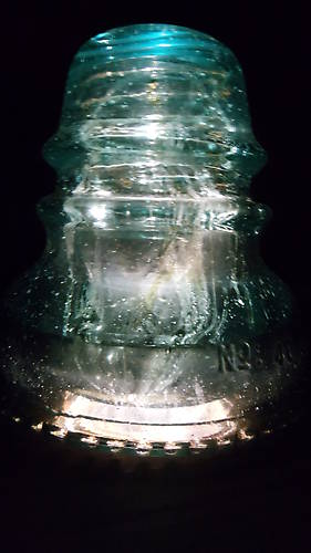 Hemingray #40 found on the way home in a pile of poles. It has nice streaks of fizz and amber throughout the back, and snow throughout the entire piece. Trying to find a way to get a better picture to show everything but not have to much light, like the light display at the Natrona show made by Sandy Bules. |