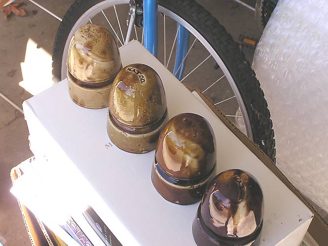 N.A.T.CO. porcelain beehives. The second from the left and the far right ones are incused on a recessed background. The second from the right is under glazed.