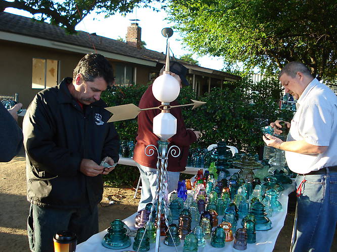 I finally found time to post some Rohde Ranch pics to supplement those that Colin recently posted. Here we see Dwayne Anthony on the left, and Mike Doyle on the right (with an insulator in each fist). Hiding behind the lightning rod is a bashful Bill Heitkotter. The sales table in this pic belongs to Dwayne. The weather was unseasonably cool, especially in the morning. |