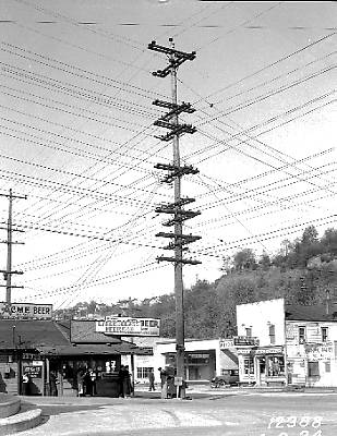Another proudly standing Seattle City Light pole, well adorned with plenty of crossarms and insulators...and many electric service wires attached to it. Poles like this certainly must have been a dream (or maybe a nightmare to some?) to climb...And not to mention change over to a new pole when the time came.... |