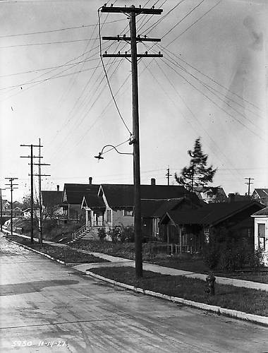 This type of street light fixture and bracket dates to around 1900 - 1915. Typically a CD 280 glass insulator was used in connecting the end of the bracket pipe to the fixture, thus electrically insulating it. Similar types of insulators including porcelain and composite material were also used for this purpose. |