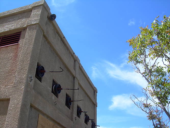 Last weekend I found a rare 12" thomas disc used on the Childs power line from Fossil Creek Az. to prescott in my home town of Mayer, I knew I had seen one before. Today my son and I found the place I had seen these before. On the top left corner of this bldg. you see one hanging and see that at one time their were six of them across this bldg. |