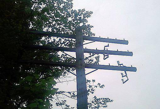 After driving about 10 miles on said road, there was nothing to be seen of the "Bell Line" until I came around the corner and saw this. The next 5 miles were loaded with old notched poles closely spaced, but only 2 still had crossarms and a couple of 154's and 128's like this one. Poor quality cell phone pic :( |