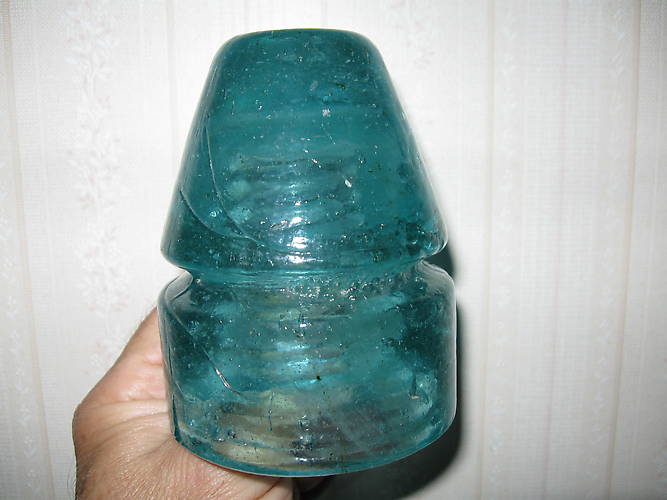 This one is a bluish aqua with fizz and cotton around the pinhole. It will screw part of the way down onto a used wooden pin.