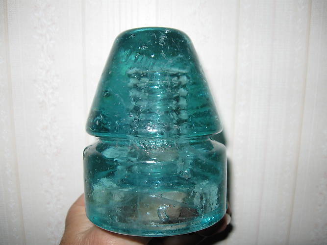 This one is a junky bluish aqua with milky strings. Will not screw down onto a used wooden pin.