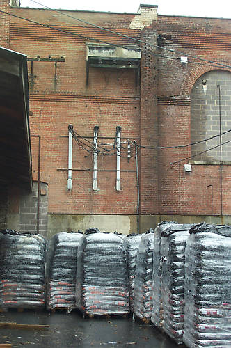 On the back of this circa 1900(ish) power plant, were some spools that needed to be liberated... You can just make them out under the Asbestos enclosure. After a call to the owner, we were given the go ahead to rescue them. One problem, 40 pallets of mulch were blocking our route. He said, " give me a call in June ! " ( that was this past March.." |