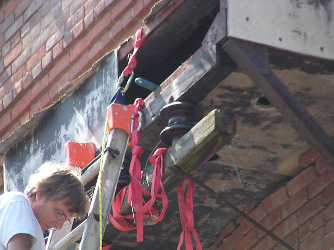 Mike had the end of the rope, and carried the weight, while I guided the arm down to clear the live wires...