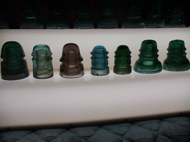 Picked up these nice pieces over the weekend at a flea market and antique store. First is a nice ambered up B beehive. 2nd is a CD 121 AM Tel & Tel, not exactly sure on the color, its a pretty nice piece I can't wait to see it clean. 3rd is nice CD 161 California in plum. 4th is a Hemingray 12, the threads on one side droop down so much that only the top couple threads that are not drooping will thread onto a pin. 5th is a Hemingray 12 in emerald green. 5th is Hemingray 40 full of amber swirls. 6th is a CD 152 Brookfield, it is full of amber and the top above the wire groove is shifted over so much that the pin hole is right up against the side of the insulator. |