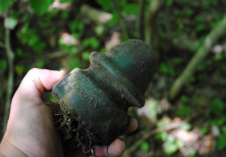 A Hemingray (F) No.19 (R) CD 162. After walking (with my trusty cane) for nearly two miles my insulatoritis mojo has been recharged, and this unadvised hunt is justified! I'm not sure on the color yet (it's still soaking) but it appears to me a nice light aqua. Now, to get back to the car... Thanks for looking! |