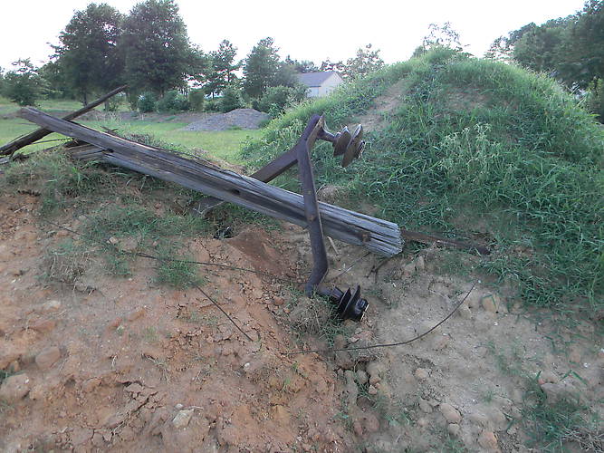 This pole is hard so it took a long time to cut but when it came down it landed it perfectly on the dirt mound! The top of the pole snapped under the bracket and insulators.