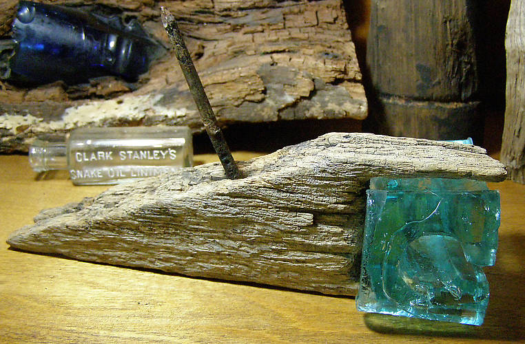 No, not a recent find, but one worth reporting. Well over 30 years ago "Jack" and a collecting buddy found two glass blocks on original wooden side pin brackets mounted to an Elm tree in Addison, VT. They each removed and kept one block. An attempt was made to remove the side bracket that held Jack's block, but it was severely damaged and left behind. No attempt was made at that time to remove the second bracket. Some years later Jack attempted to once again locate the Elm tree with the lone bracket, which he did. He gently removed this side bracket in one piece and placed it in his collection. Only one thing was wrong...his buddy had the original glass block that went with the side bracket in Jack's collection. Some time later, Jack purchased his buddy's collection, and the original glass block was once again reunited with its proper side bracket! Fast-forwarding to 2011, Jack sells his collection, and this rare specimen now resides in a California collection. Based on early drawings, a flat wooden cap was originally installed on the top to hold the glass block in place, but was not present on either bracket when they were discovered in the 1970s. How many original side brackets with glass blocks exist in the hobby, much less with a CD 1003 block? This is the first I recall seeing, so drop me a note if you have one or know of any others (I know there are at least 2-3 western Pacific Pottery blocks in brackets out there). |