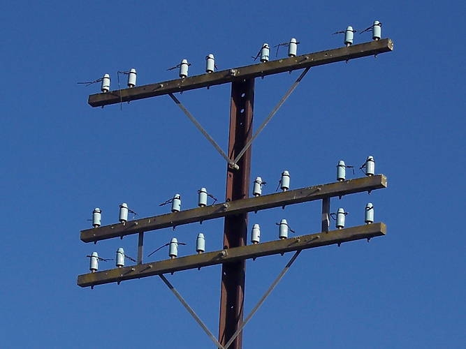 Disconnected pole full of light blue U-1154 insulators in Goulburn, NSW.
