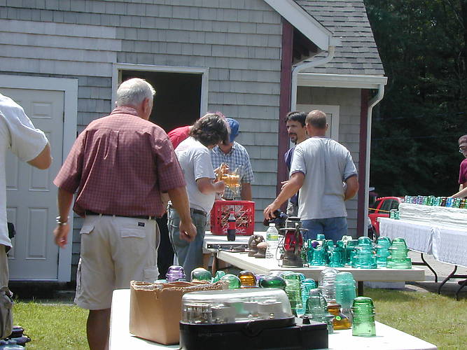 Several people examine this nice Pyrex piece. Very good carnival color. CD 324 or CD 327?