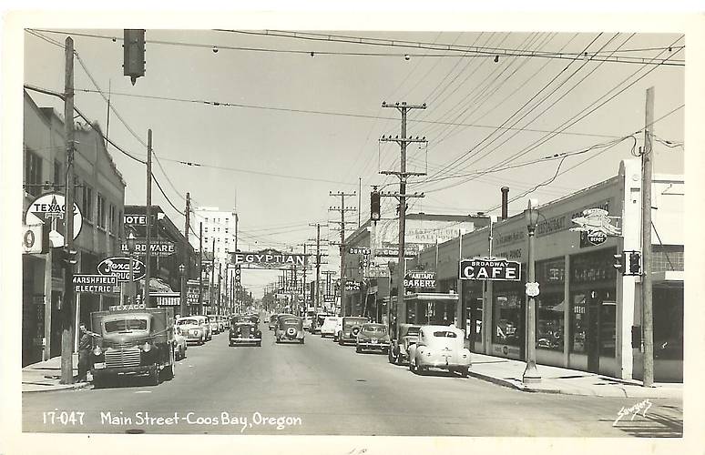 A busy main street in Coos Bay, Oregon circa 1947. The street was actually Oregon Coast Highway 101 but today 101 is (luckily) bypassed 1 street over. The power line on the right, with the myriad of wires belonged to Mountain States Power Co. The line on top was a long 22,000 volt line from the MSP steam plant nearby to Coquille, OR. The dual circuit 2300 volt lines below with 6 insulators make the line look even busier! MSP was always full of 'tricks' like the 3 wire secondary raised high on the pole near the 2300 to reach over a building roof! Secondary and street light wires are carried on the bottom arm. There is even a "festoon" light wire, high foreground, with sockets and bulbs. Across the street are two ring cables of the West Coast Telephone Co. But once south out of the city center, it turned into a long line 5 crossarm open wire spectacular! A nice array of old vehicles and signs and just how things looked when I was a wee lad! The large Egyptian sign is a theater and the tallest bldg. in CB (10 strories!) is the Tioga Hotel with sign barely visible. Both exist today. A clue to the town's former name is found on the sign just above the GMC Texaco truck in far left, Marshfield Electric. Since the town of Marshfield was situated on Coos Bay itself, the town was finally and logically named Coos Bay. Today Coos Bay, North Bend and Empire form the largest population center on the Southern Oregon Coast. MSP power is now Pacific Power and West Coast Tel. became part of General System and is now Verizon land line. Most of the buildings in this pic still exist but compared to this scene, it's a total makeover! But still busy! |