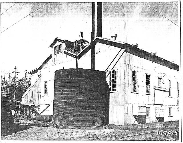 A view of the street side of the Mountain States Power Co. steam plant in Tillamook, Oregon, looking east. I hope to find a photo of the east side of this plant, which sported a large sign of the company shield saying that MSP were "Pioneers In Public Service". Since this is MSP photo number 5, there must be 3 more somewhere! The entire building is sheathed in corrugated metal, typical of the area. Not exactly good looking but definately fireproof! Note the steam whistle, which had to be what the workers urgently waited for. Lunch time or quittin' time! |