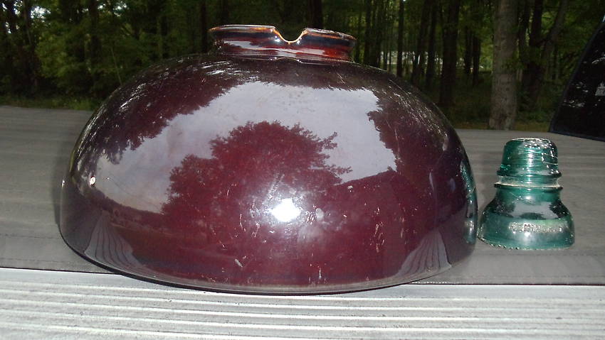 found this large piece at a flea market today, it is just the top of a insulator. I put the hemi. 40 in for comparison of size. It measures 15'' across by 7 !/2 '' tall. If anyone has any info, please let me know what it is.