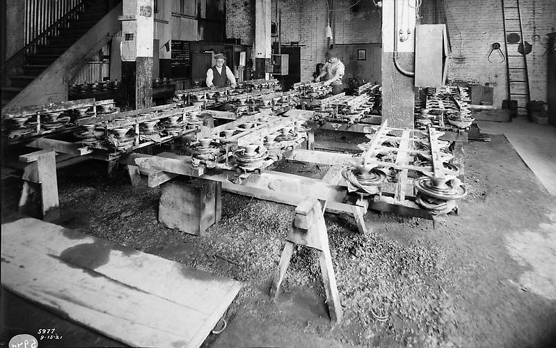Assemblying (cementing?) insulators in the insulator room. Photo dated 9-15-1921. From the Huntington Digital Library.