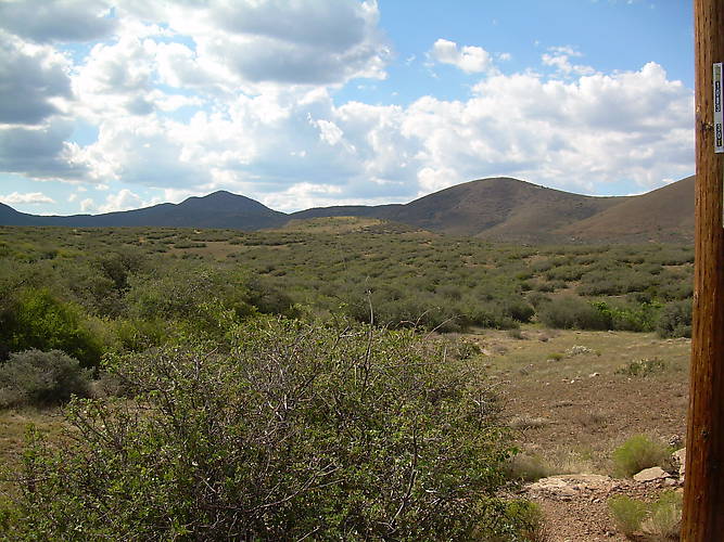 When I found a tower base at Poland Jct. right next to hwy. 69 and only a couple miles from were I live I knew that I must check it out. This picture was taken while standing on the tower base. The line on its way to Walker goes over the hill in the forground |