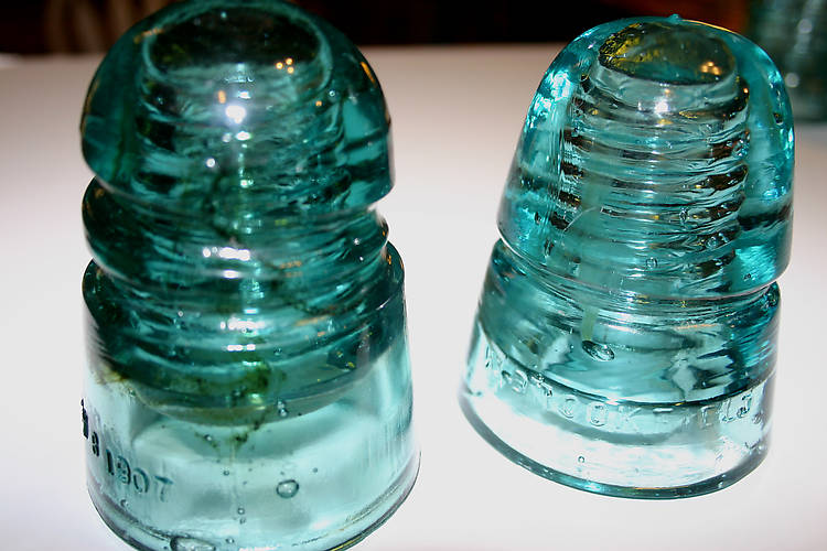 Here's the spiral groove with a nice long trail of carbon & amber and a "Brookfield - New York" beehive with a nice milk streak. We picked these up on the CN line on our way down to the Racine Swap meet.