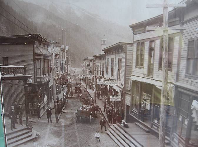Pic of Sandon, BC before the fire of May 1900. The insulators on the right appear to be white spools. Not too interesting. Only a few buildings remain today from the re-built town. I went there for another poke around in Sept. 2011. Here's a look: [id=320776978] |