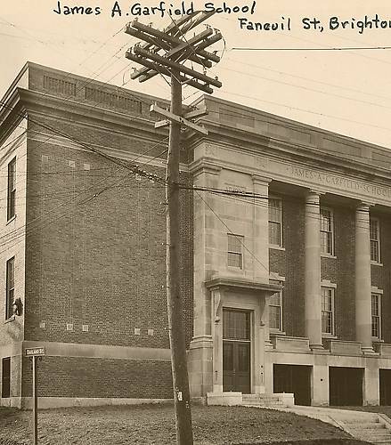 Edison Electric Illuminating Company of Boston's work is atop this cool piece of architecture. A scattering of this type of construction still exists in older neighborhoods within the former Boston Edison system where the primary voltage is 4kv. Beneath is a sampling of what the Boston Fire Department alarm openwire looked like. This four-pin crossarm is mounted via two lag-bolts. Many Standard Glass signal insulators were employed along Boston's Fire Alarm circuits. All of their crossarms were painted white with "Fire Alarm" stenciled in black paint so they could be easily identified. |