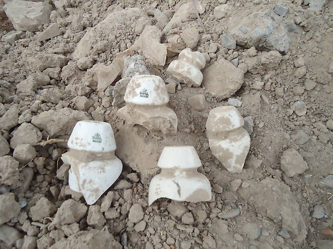 I knew this would happen sooner or later. Some dedicated silly persons with a truck packed with explosives blew a large hole in our base perimeter wall. Everyone pitches in to secure the area and repair the damage and in the process, this bunch of insulators was dug up. No clue about these other than they look European and two have the green underglaze Rosenthal marking. Any thoughts about vintage on any of these ? Hard to imagine these stone age villagers getting all electric even today, let alone a long time ago. |